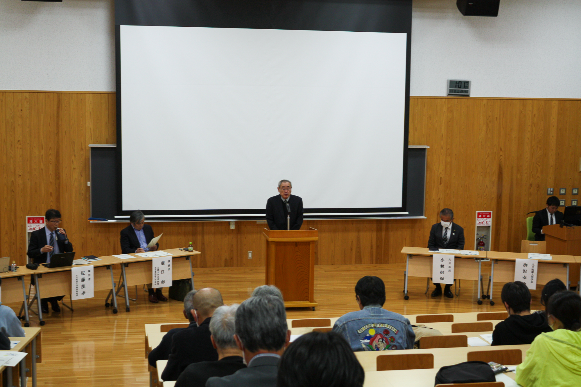 シンポジウムは最初に柳澤学長の挨拶が行われ、今年度から開設されたセンターの意義が強調されました。続いて小林市長からの挨拶ではセンターへの期待が語られました。その後、センター長よりセンターの概要の説明と大月短大における地域研究と地域活動のこれまでの取り組みが紹介されました。