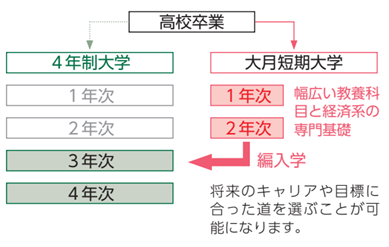 編入学とは、短期大学卒業後に、4年制大学への3年次、あるいは2年次に途中入学できる制度です。
